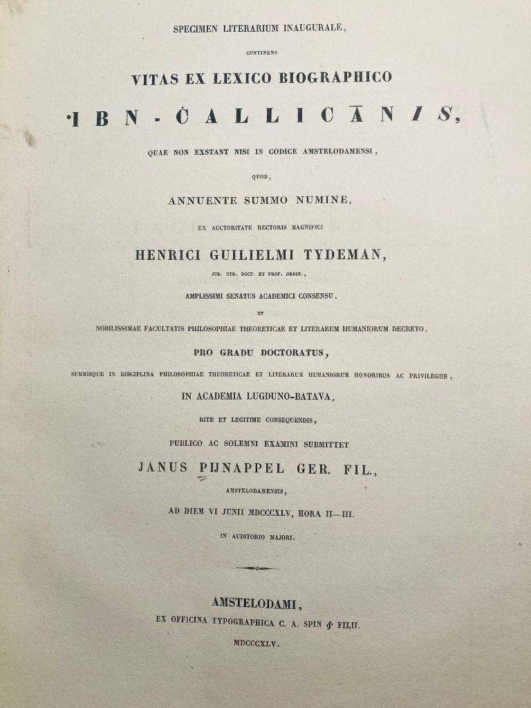 Specimen literarium inaugurale: continens vitas ex lexico biographico .Ibn-Callicanis quæ non exstant nisi in codice Amstelodamensi. [al-Tarājim min kitāb wafayāt al-aʾyān allattī mā tūjad illā fī al-nuskha al-Amstardamīya], ed. Pijnappel, Jan.