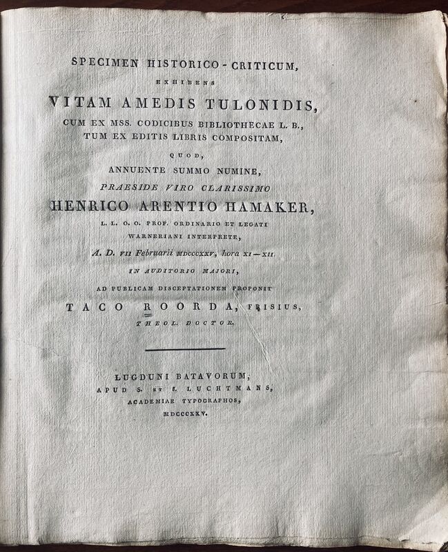 Disputatio by Taco Roorda (1801-1874) under the chairmanship of Henricus Arentius Hamaker (1789-1835) at the University of Leiden. Luchtmans was the publisher of the university (apud acedemiae typographos)....